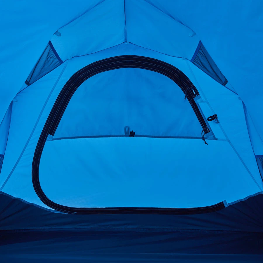 A 30D high tenacity polyester rainfly and floor keep the pack weight low and is seam-sealed, durable, and does not sag in wet conditions. The rainfly uses a mixed polyurethane and silicone coating for a waterproof rating of 1500mm while maintaining a high tear strength. The colour pigment is applied as part of the outer coating in a more environmentally friendly process than traditional fabric dying.