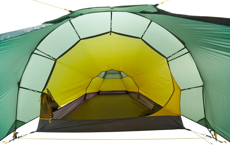 A wide front entrance opens onto a spacious porch area for gear storage and meal prep. The wide door means you can shelter in poor weather and still enjoy the view. A large inner cabin is easy to attach and features pockets for keeping smaller essentials close to hand. The Halland 2 features a protected vent at each end for airflow and moisture management in warm weather.