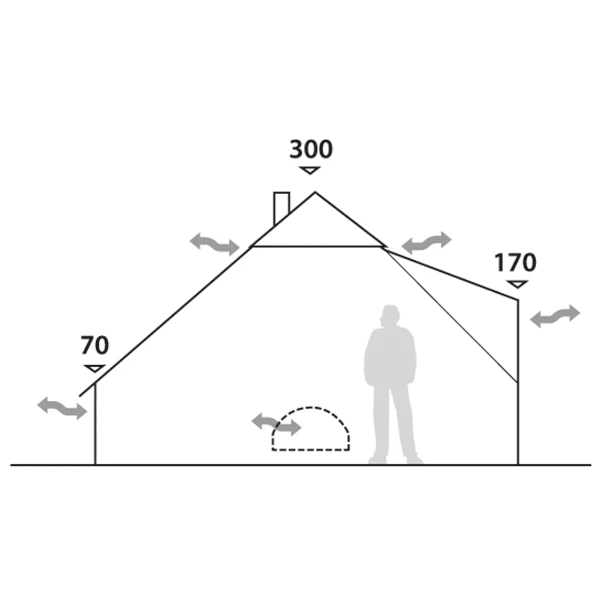 lets water flow off, and the fibres swell up in heavy rain to create a waterproof roof. The tent floor that zips into the flysheet is made of extremely waterproof polyester. An extra zip runs to the central tent pole so that part of the floor can be folded up. The space created can be used for a portable camping stove (there is a chimney opening in the tent roof) or as somewhere to keep muddy boots.