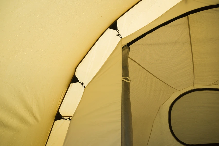 The Vault pitches outer first with a 3-pole tunnel structure and multiple guylines for stability through changing weather conditions. Colour-coded poles and matching sleeves make it quick and easy to pitch. The inner bedroom compartment attaches to the flysheet with a loop and toggle system and can be removed to create a fully sheltered dining space with 150cm headroom. This handy feature means you can transform the Vault into a garden dining shelter or beach shelter for day trips.